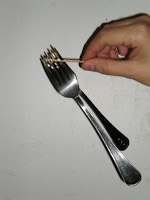 4. Por último si se sostiene el conjunto por el palillo de dientes A (ver imagen) permanece en equilibrio estable. Por el contrario, no es posible sostener el conjunto por el palillo B.