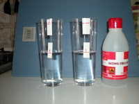 Para realizar nuestro experimento necesitamos un par de vasos (mejor si son largos), agua y alcohol. Necesitamos marcar el nivel del agua y del alcohol en la superficie de los vasos. Podemos usar, por ejemplo, un rotulador.